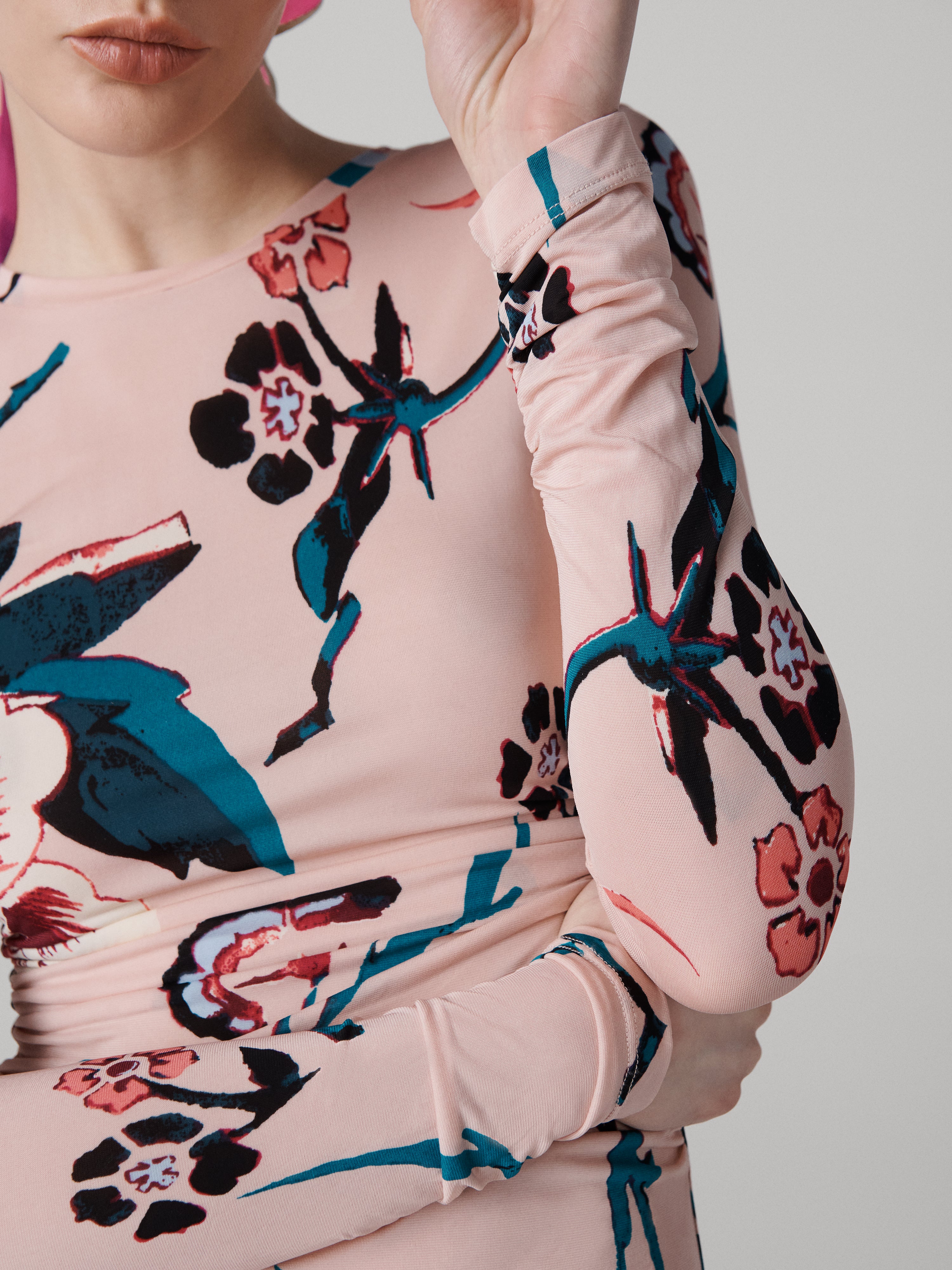 A textured, light and drapey hammered satin fabric with a smooth subtle sheen.