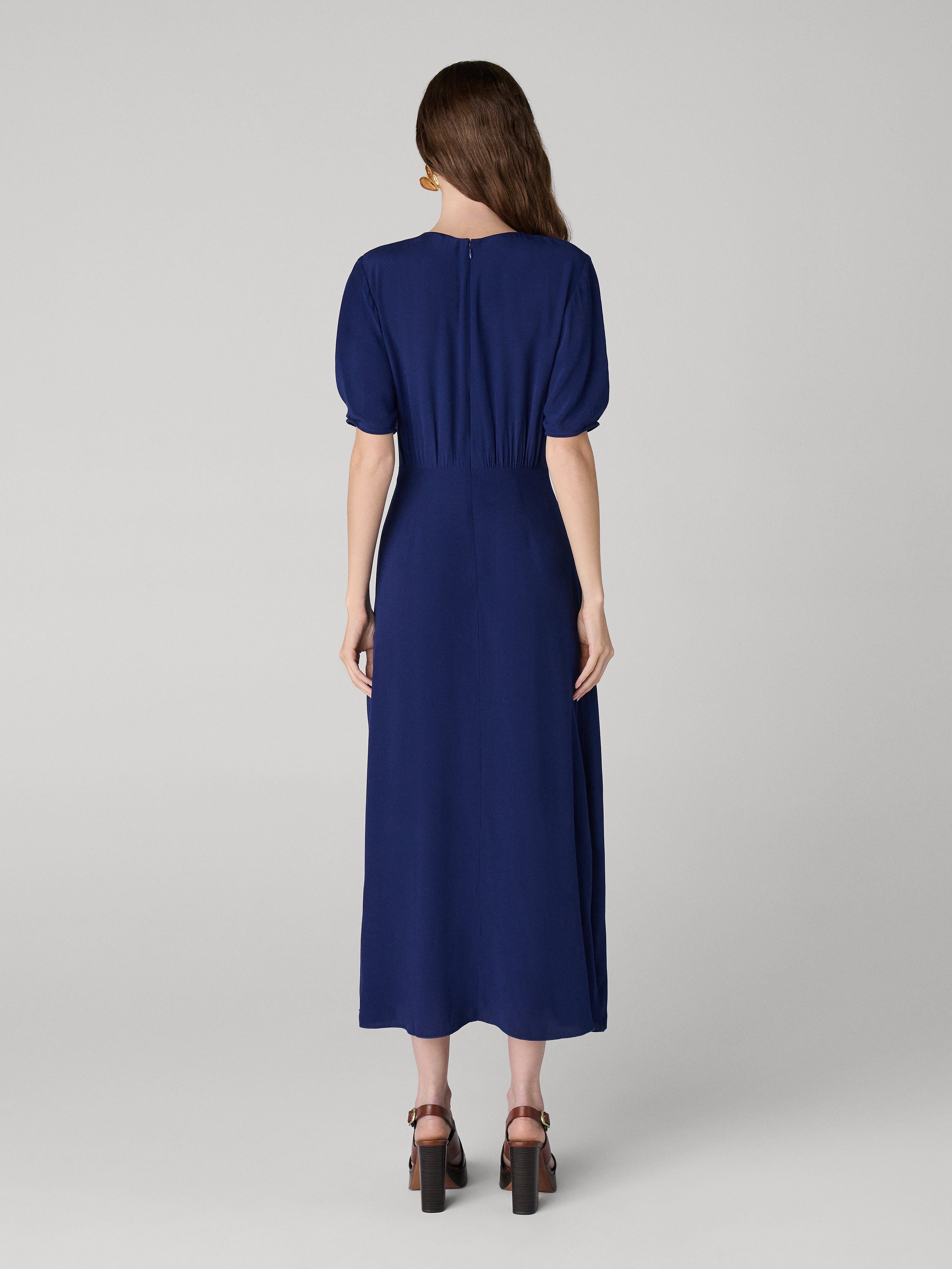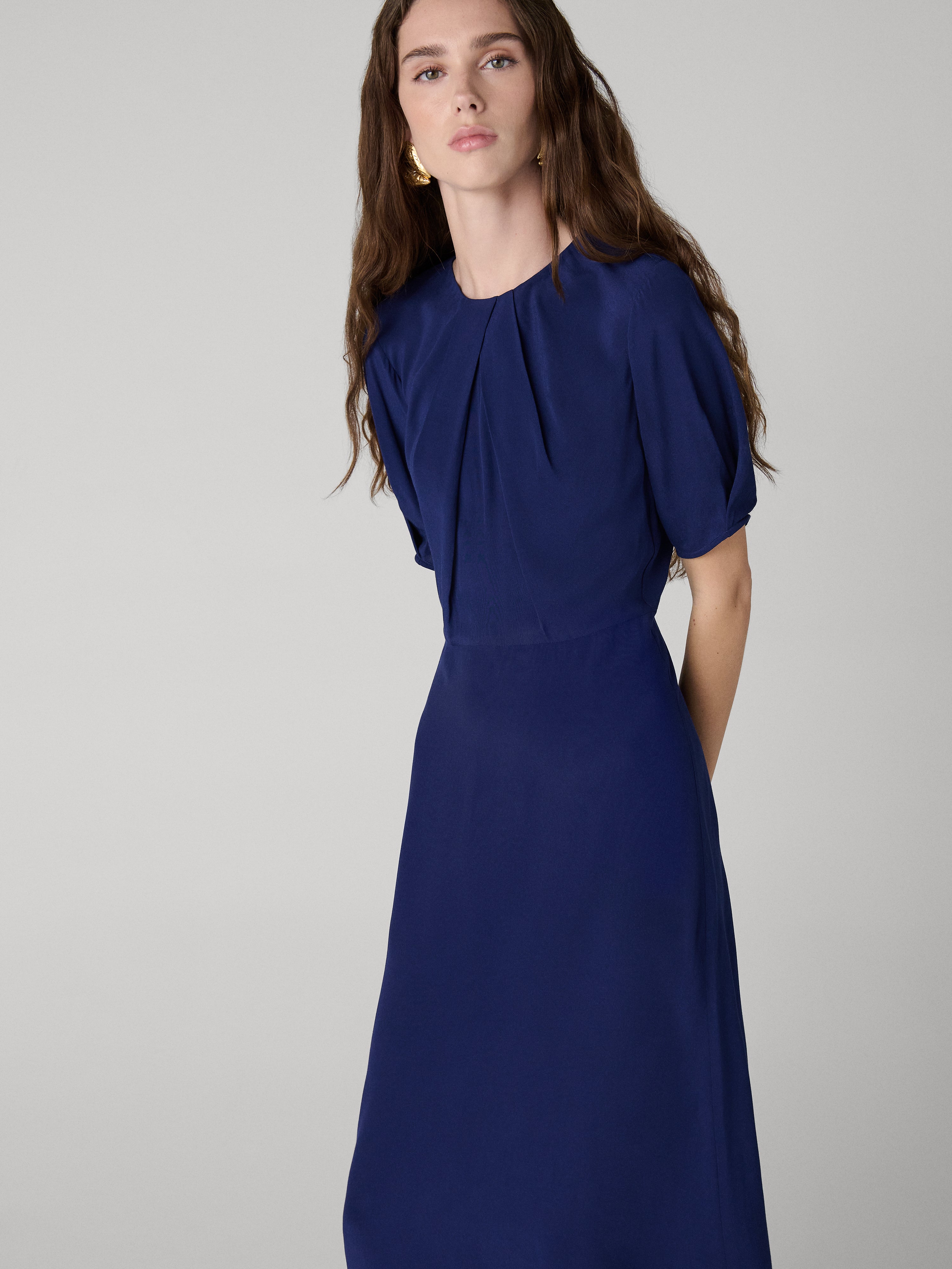 The Janine Dress, crafted from our new crepe fabric, is a sophisticated style designed for versatile wear.