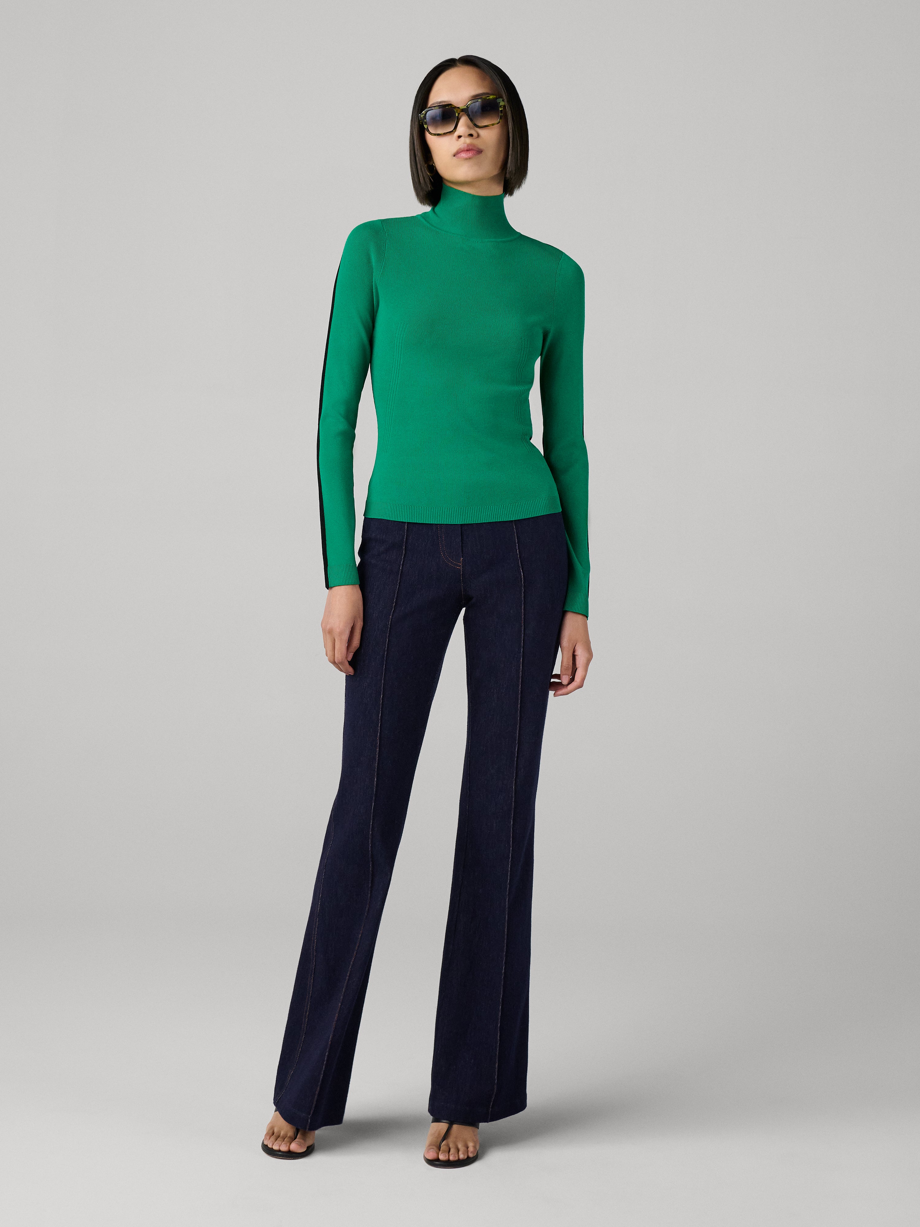 The Jelena Top is a sophisticated soft-knit turtleneck, thoughtfully designed with a color blocked silhouette.