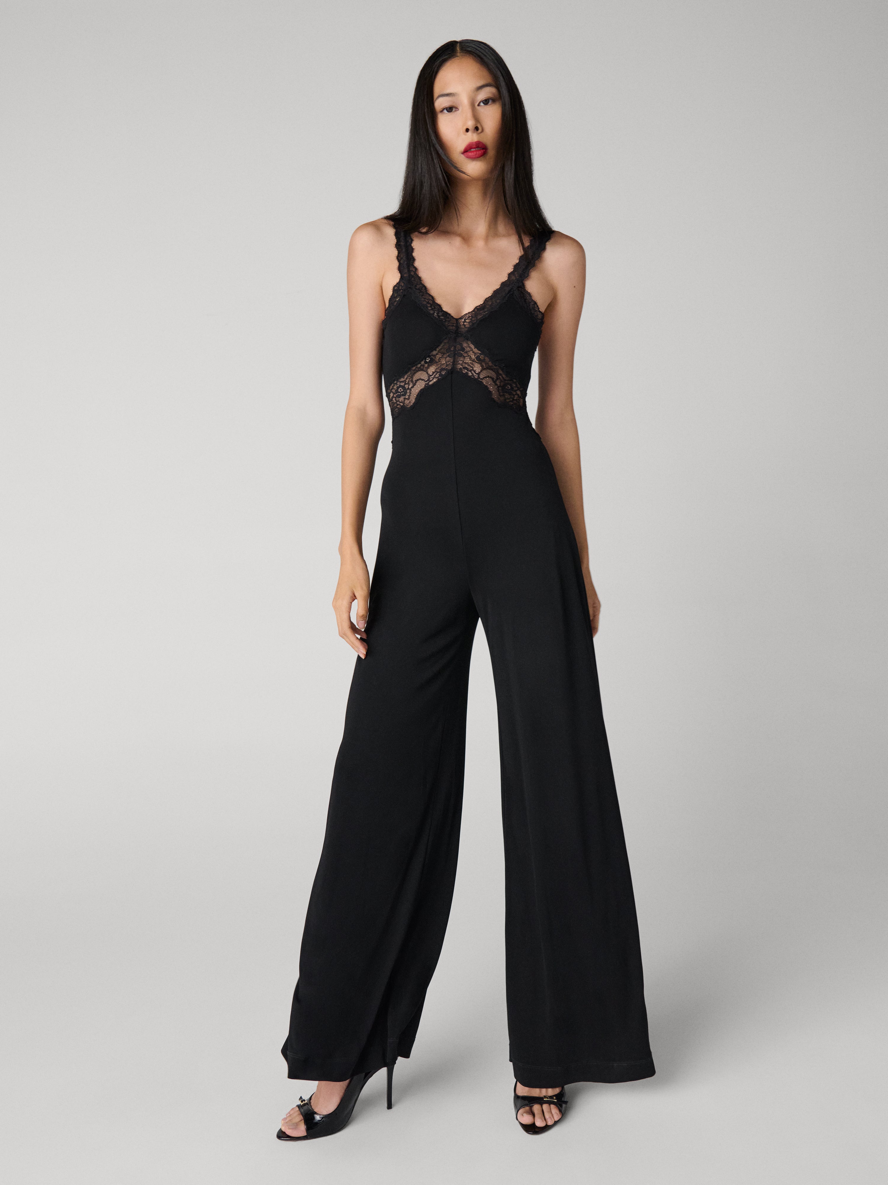 The Rosa Top is a sleek black wrap top adorned with delicate lace detailing.