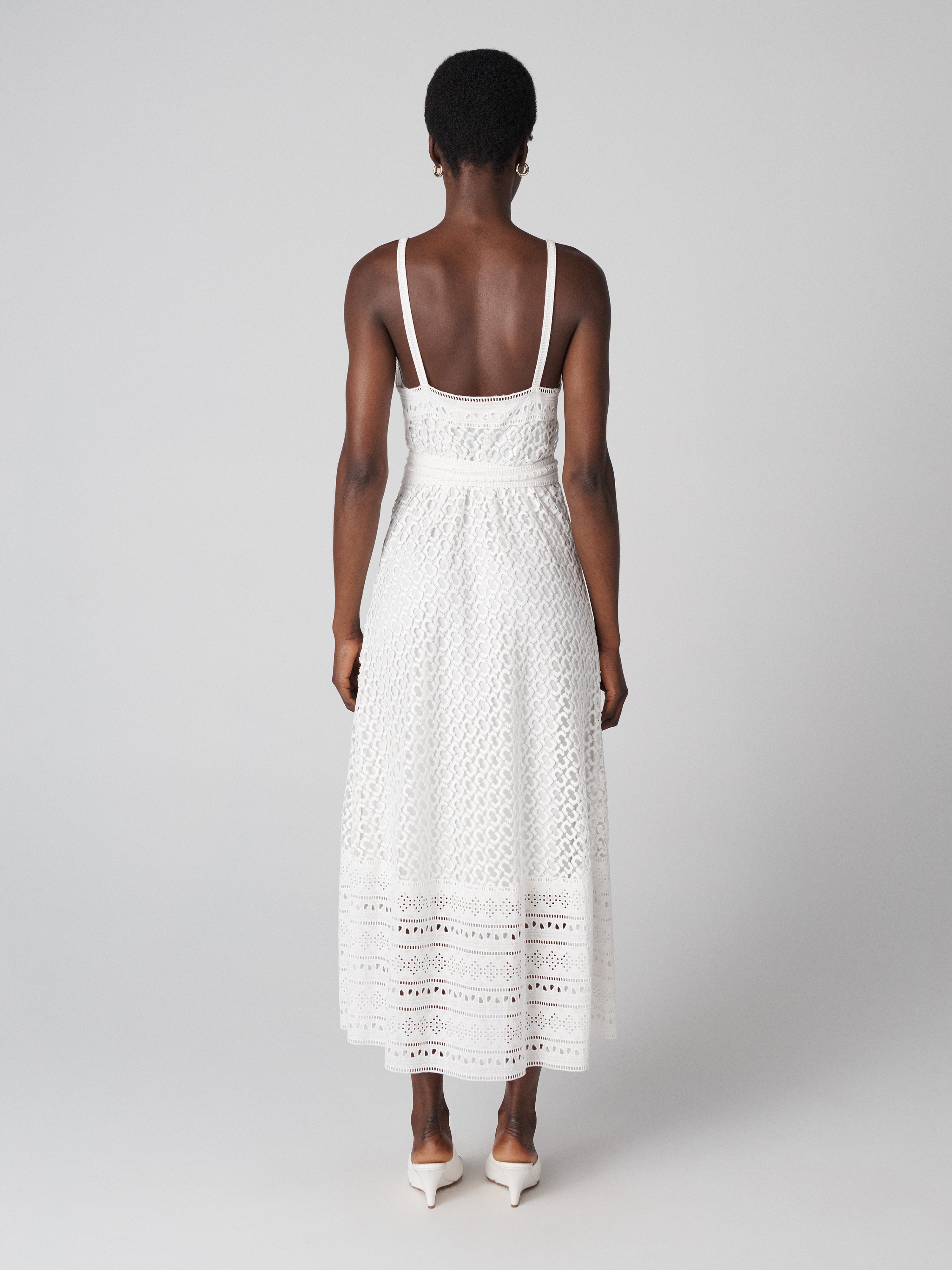 The Evangelia midi wrap dress is textured with Cane Link lace detail throughout.