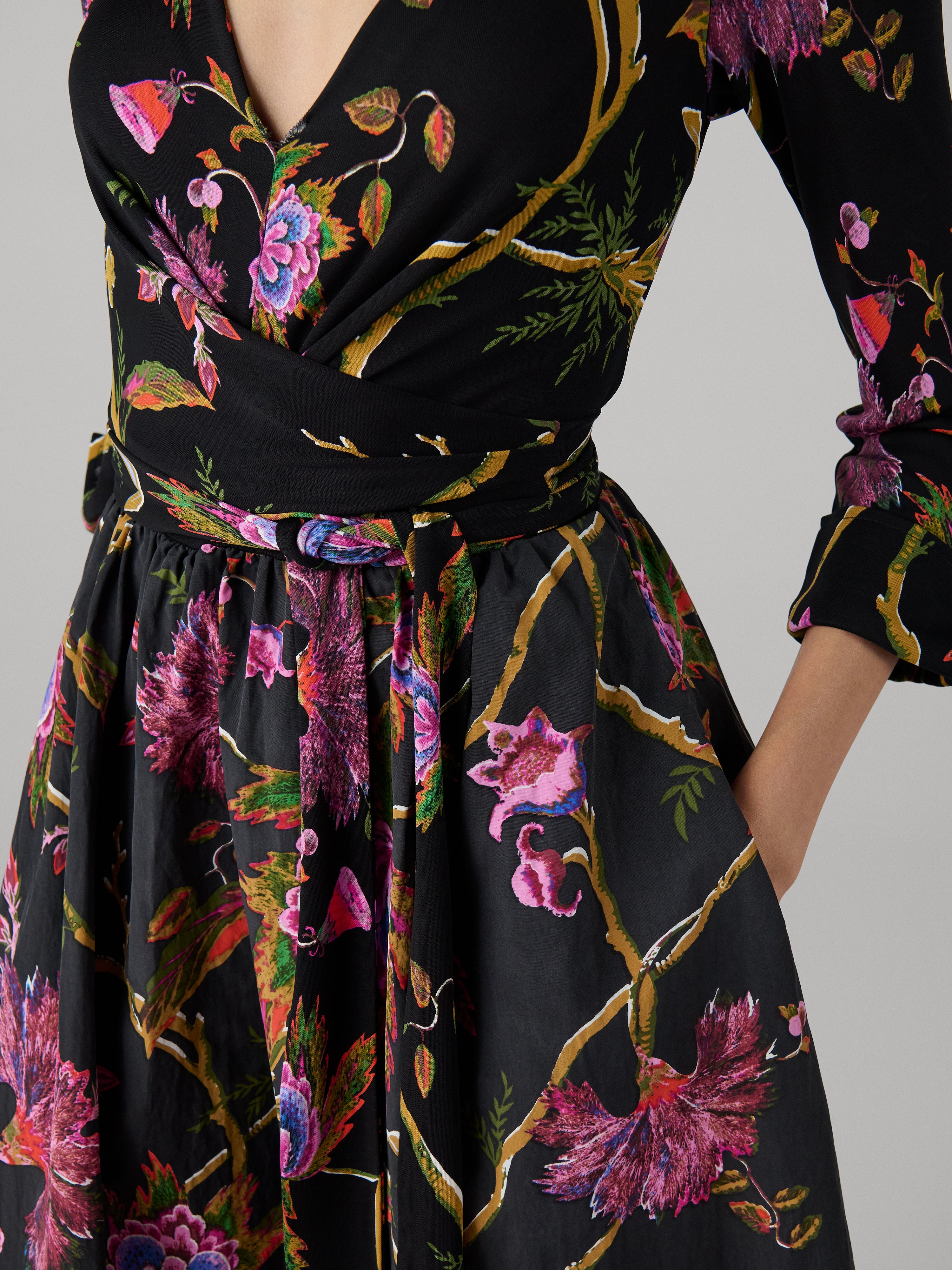The Abigail Maxi returns in smooth matte jersey, featuring a striking botanical print accented with sequin and bead embellishments.