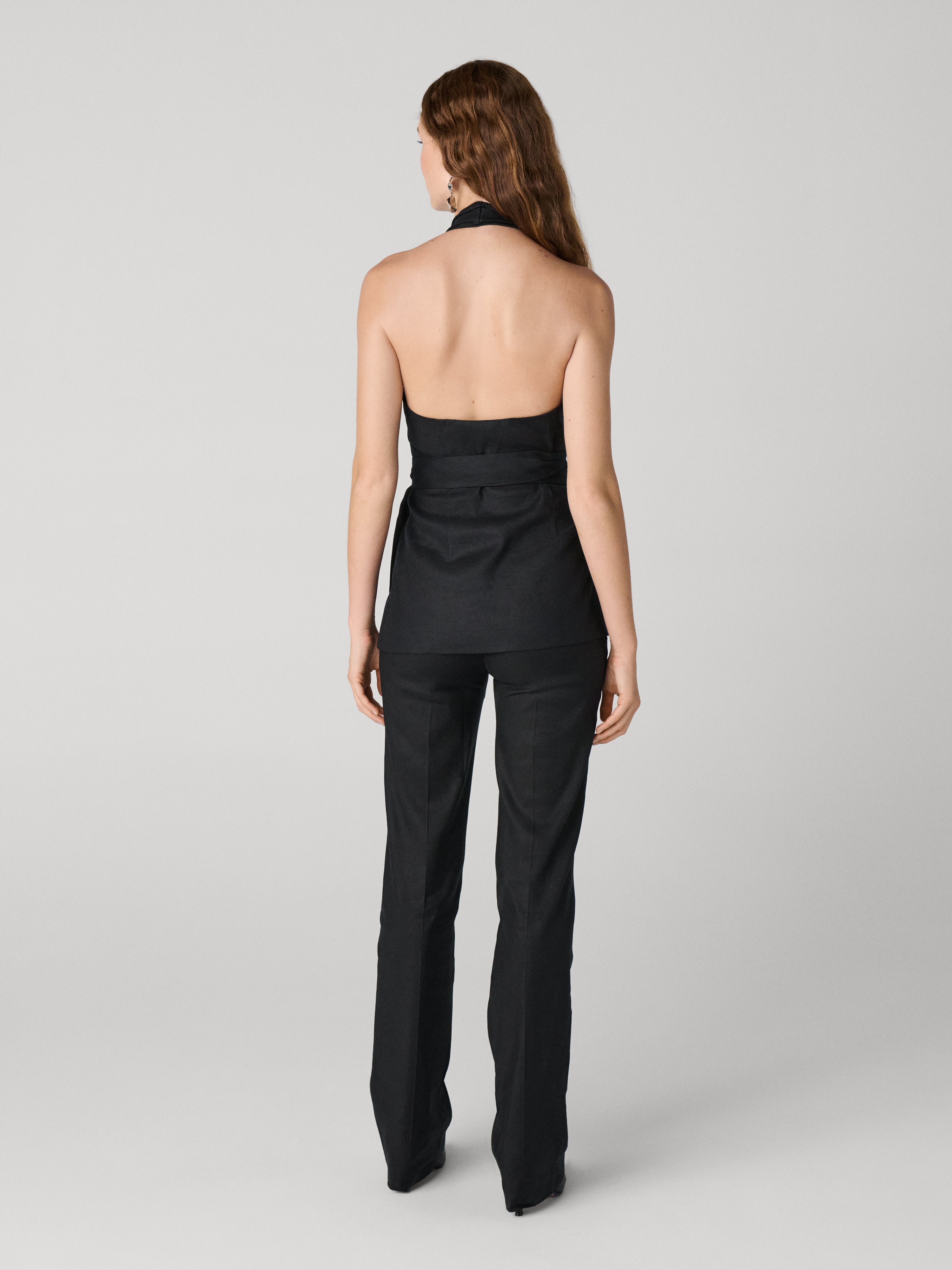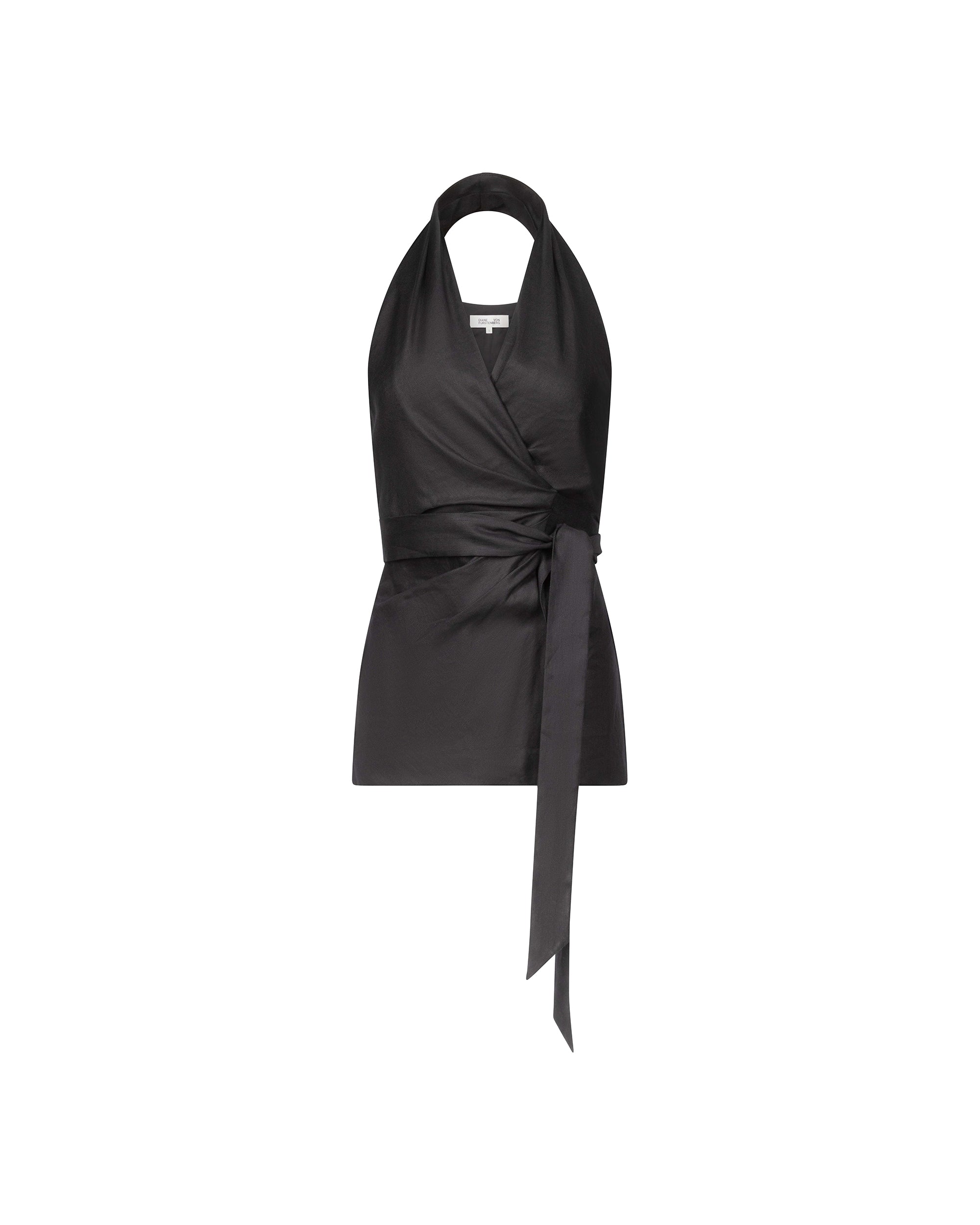 Made from a soft linen, the sleeveless Alyssa Wrap Top has a halterneck and an open back.